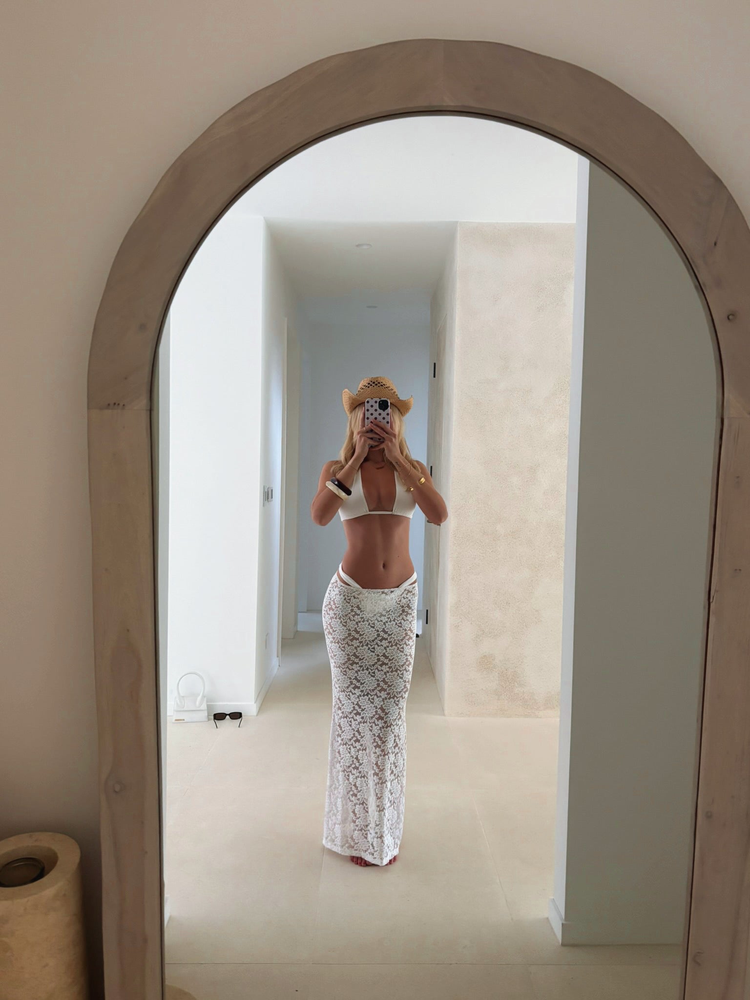 Our soft lace Ava maxi skirt designed to layer beautifully over your bikini. Light, breezy, and made for golden beach days.