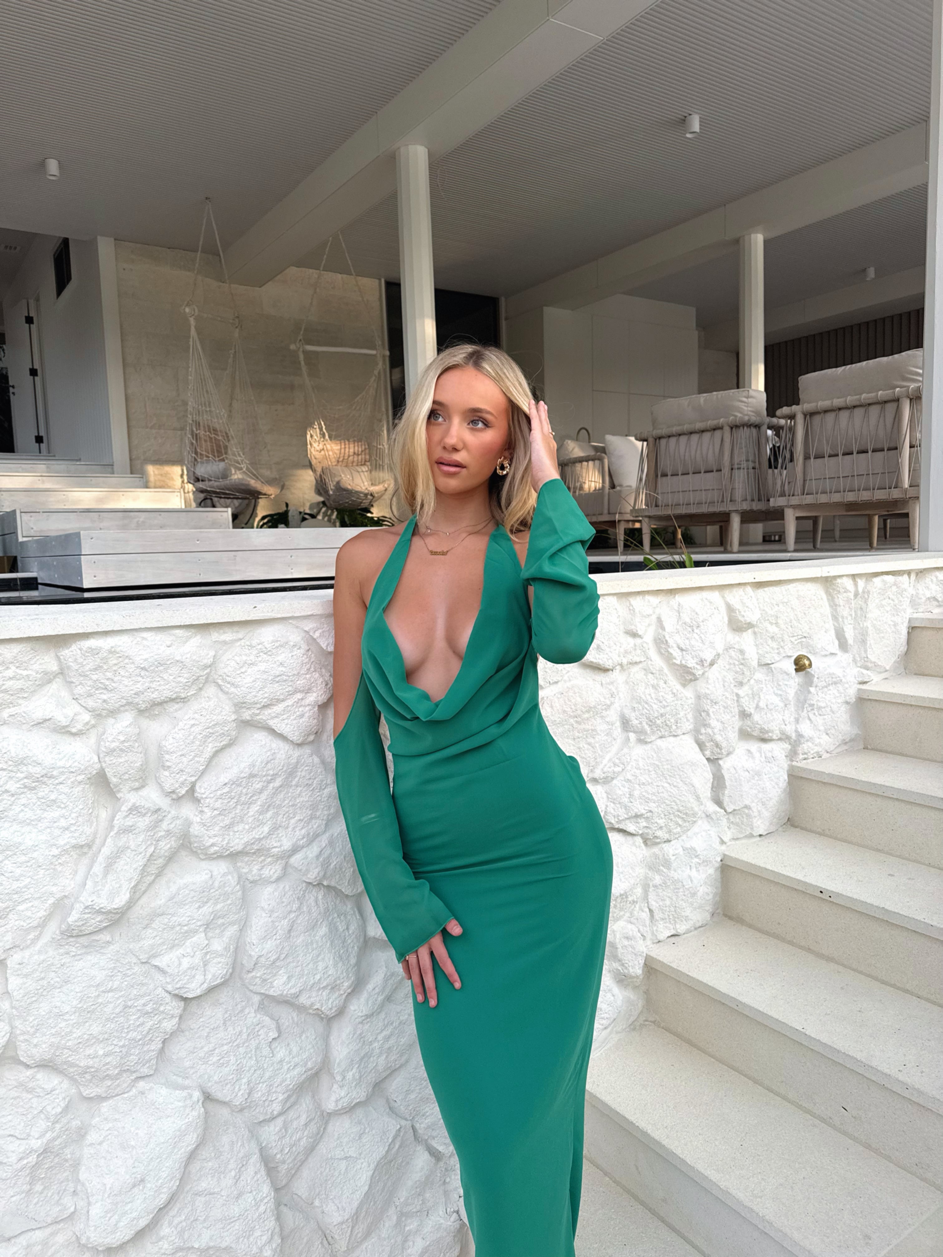 Channelling our inner goddess with the stunning emerald Thira dress, perfect for all occasions from outdoor parties, sunset dinners to beachside strolls. This dress is versatile and can be styled by tucking the sleeves in or worn out out for cooler days. Dress with gold accessories and you're ready.